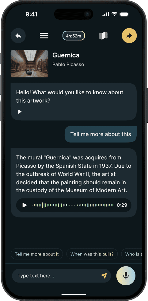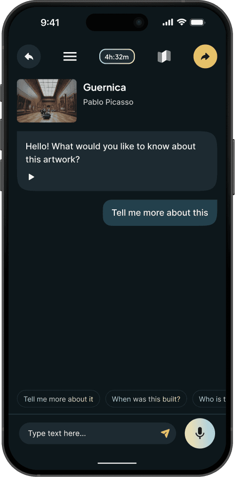 Visitors can ask questions like “Tell me more about this painting” or “Who is the artist?”, and the AI responds instantly.